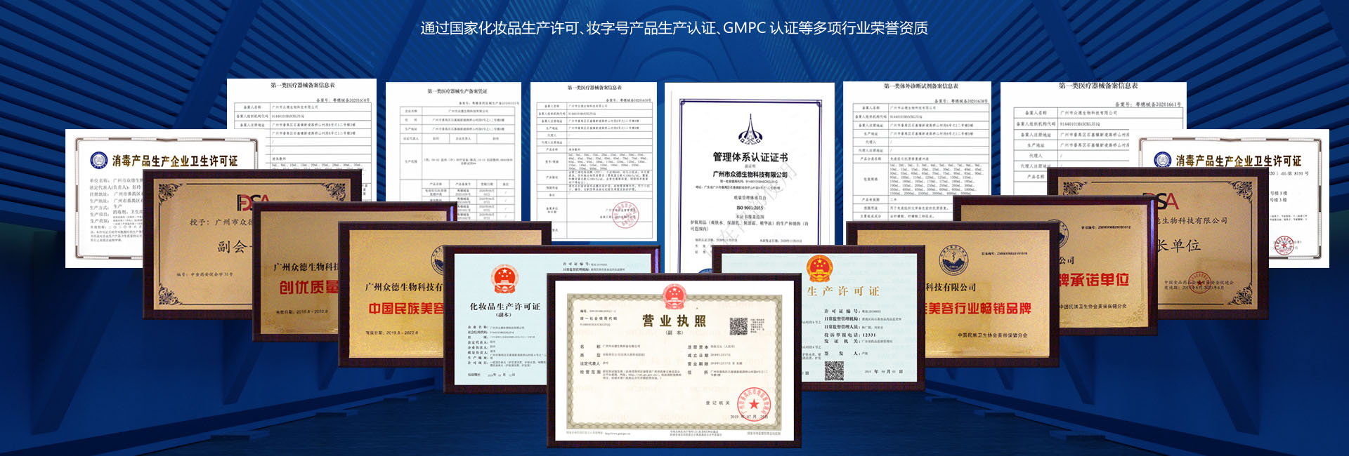 通這國(guó)家化妝品生產(chǎn)許可,妝字號(hào),消字號(hào),械字號(hào),粉單元產(chǎn)品生產(chǎn)許可證產(chǎn)品生產(chǎn)認(rèn)證,GMPC認(rèn)證等多項(xiàng)行業(yè)榮譽(yù)資質(zhì)